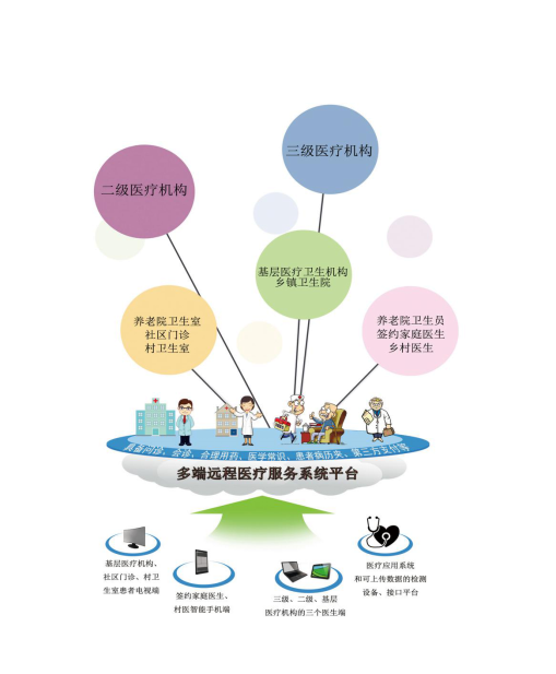 作为第三方远程医疗服务平台运营商,多端远程医疗服务系统是我们自主设计方案,自主开发,自主运营。整体设计,功能设计,商业模式设计,落地方式,发展用户手段等,是系统、完整的医疗生态圈。该系统平台将医疗,医药,结算和国家政策相互融合,在医联体内以地市医院为主,实现多条1+1+3+3+N的互联互通结构,即:一家地市级医院,一家区县级医院,三家乡镇卫生院或社区卫生院,三家与上述乡镇社区关联的敬老院,N家村卫生室和小区门诊,构成了医联体内分级诊疗制度。在该系统平台上实现地级医院,区县医院,乡镇,社区卫生院的同专业,同学科医生和签约家庭医生,村医,患者在各自终端进行在线五人交互式音视频会诊、诊疗模式。提升了基层医疗水平,留住了患者,解决小病,发现大病及时转诊。以及患者病历,检查化验报告结果,主治医生的诊断结果、治疗方案、处方等信息与基层医生、签约家庭医生、村医和患者共享,让优质医疗服务触手可及。