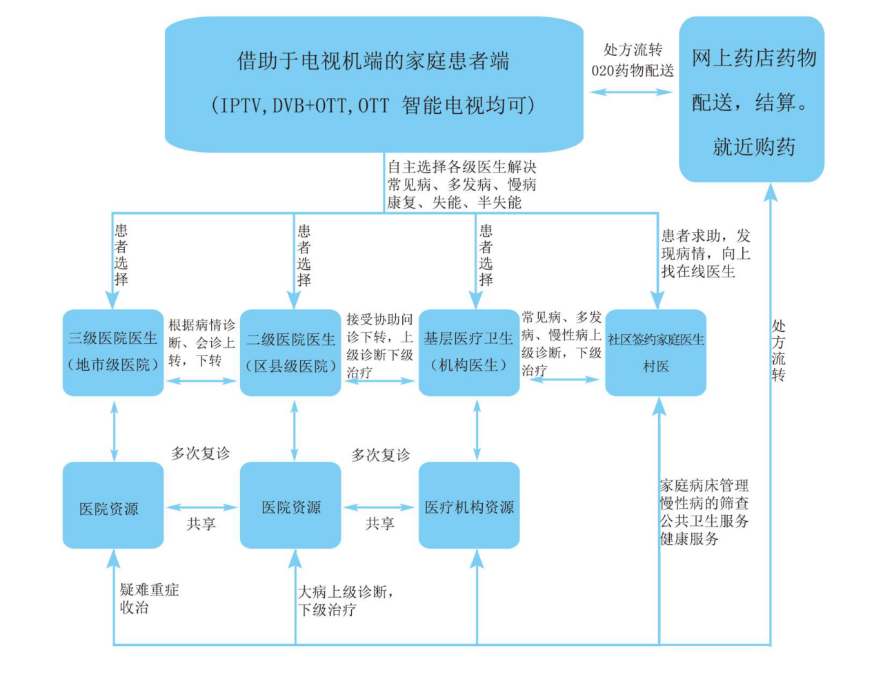 多端远程医疗服务系统和基层医疗卫生机构的终端是借助于互联网电视端,因而可以通过电视运营商延伸到家庭,为“医养结合”的居家养老提供远程医疗服务。患者足不出户,无需预约、挂号、根据医生在线不在线的显示,即可自主选择四级医疗机构的医生,实现远程问诊,多学科会诊,多层级会诊,上级诊断下的就近治疗等。该系统遵循医疗规律的各种功能,为患者远程就医服务提供问诊所需信息资料。