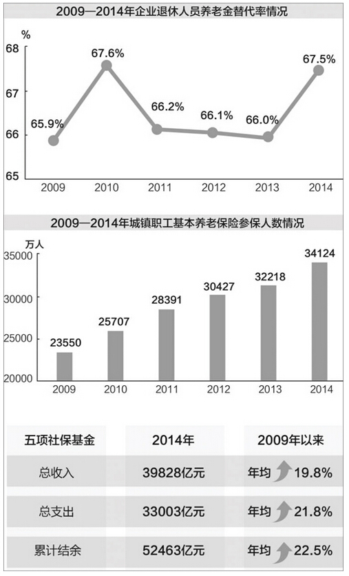 《报告》显示,2014年,按照国务院统一部署,实施了连续第十年企业退休人员养老金调整,企业退休人员月人均养老金达到2050元,比上年增长10.5%,比2009年增加825元,增长67.3%。尽管企业养老金过去5年保持年均10.8%的增速,但是一直有研究机构认为我国企业养老金替代率偏低或低于国际标准。